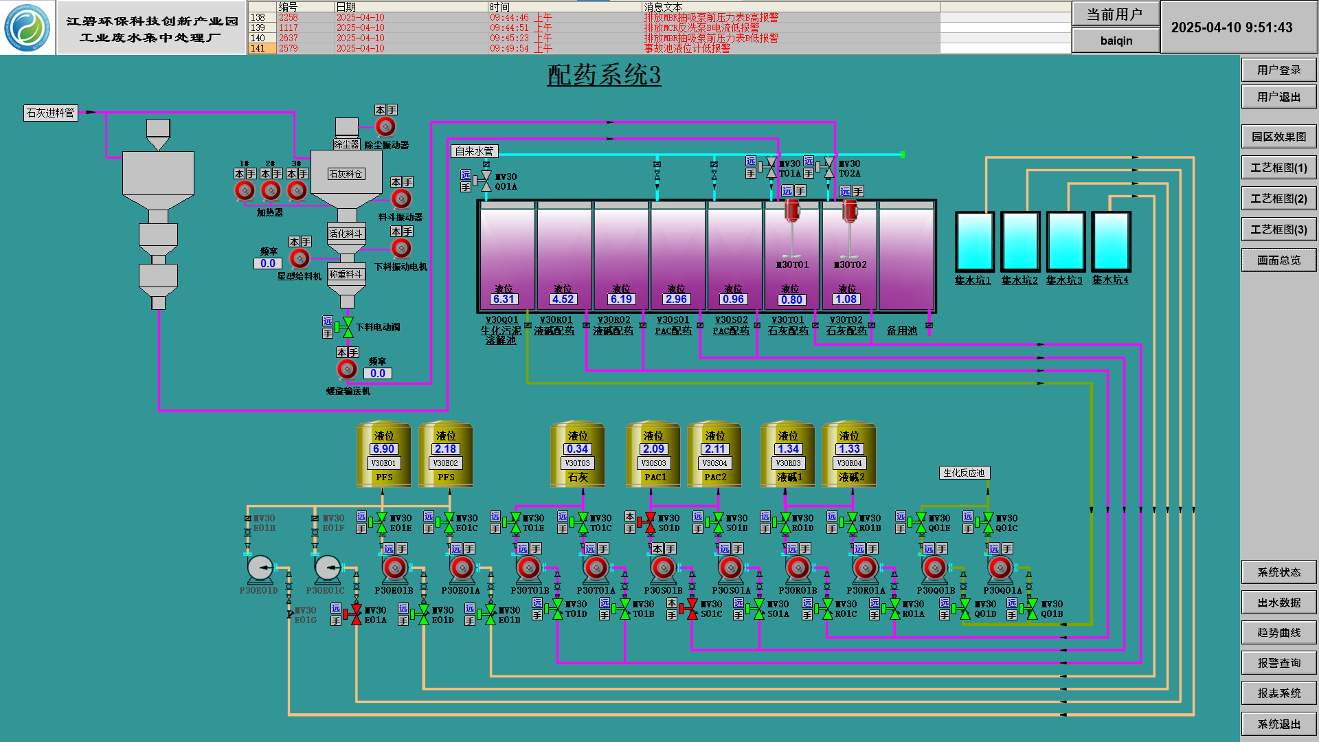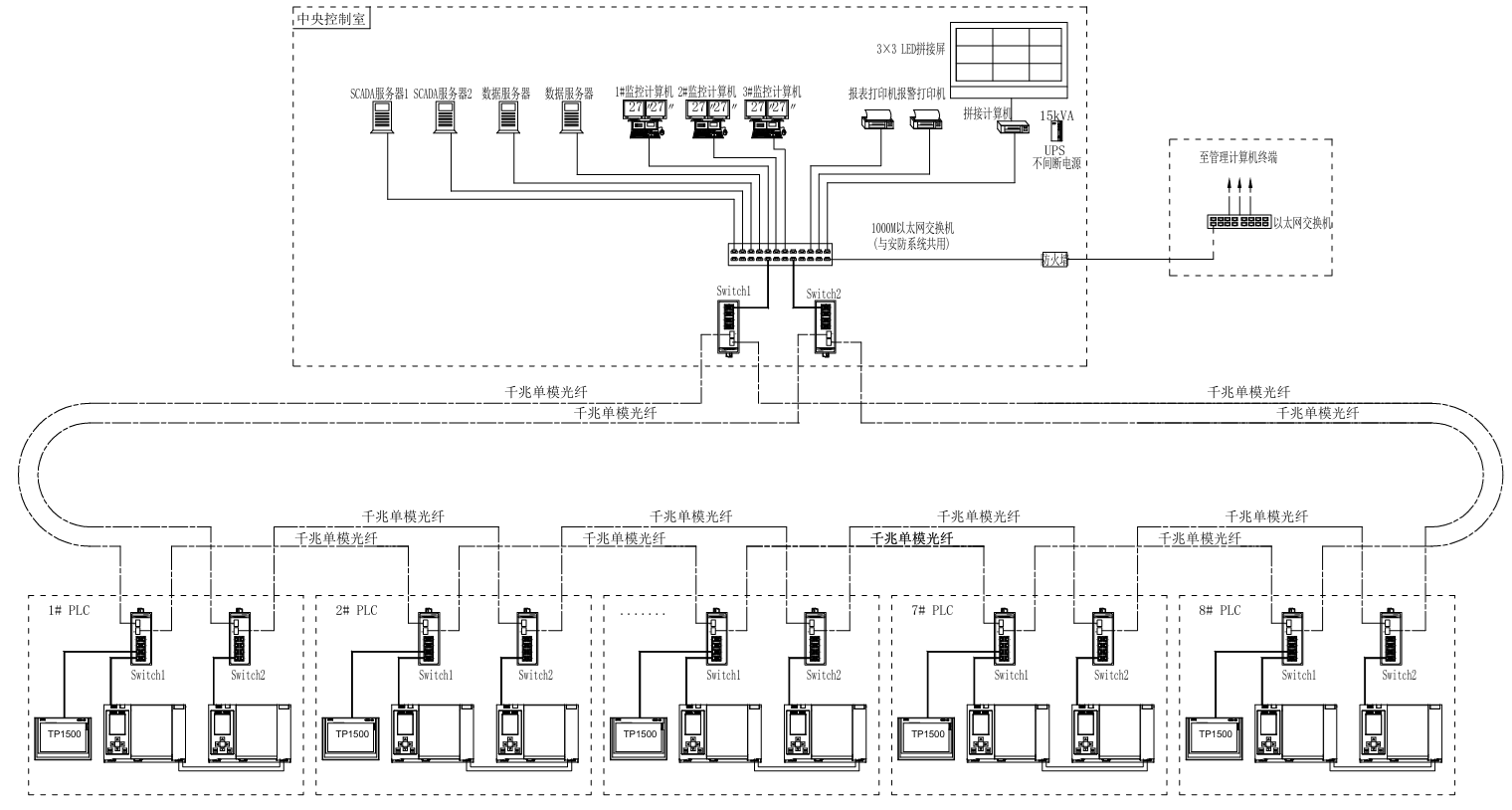 江碧工业废水集中处理厂根据其复杂工艺特点共使用了8套1517H冗余PLC,现场共配置了61套PLC柜,该系统采用为双环网网络设计,共配置了2台IO服务器,2台数据库服务器,3台双显示器操作客户端,整个系统规模达到6万点。我司负责了整个自控系统的网络规划,PLC编程和上位机组态工作。